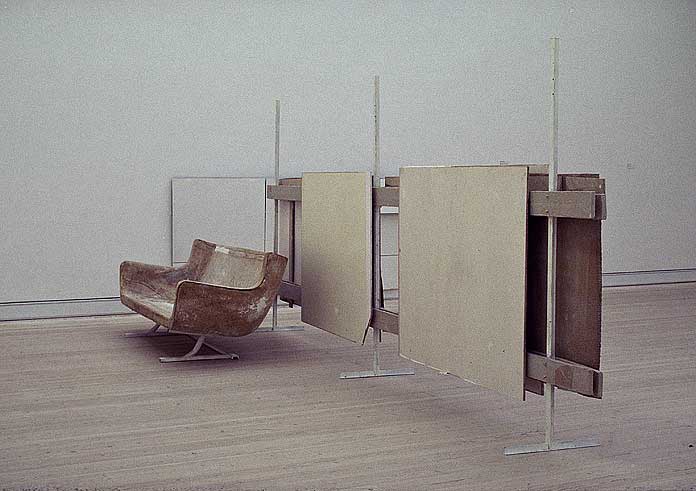 ”DobbeltVæg med dødssofa og Vægkasse” 1997 Grundtapet, spånplade, underlagstæppe, stål, sofa, bemaling. 175 x 410 x 250 cm.