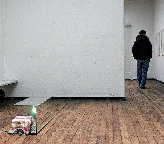 ”Drop Down the Compass and Point Out the Pole” 2005 Mirror, fiber light box, knitting, cartoons, inkjet print, glass, silicone.