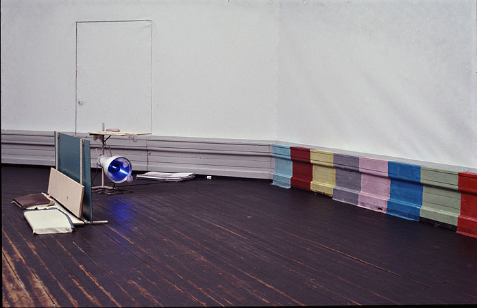 Painted steel, plywood, mirror, pillow, silk paper, UV light,